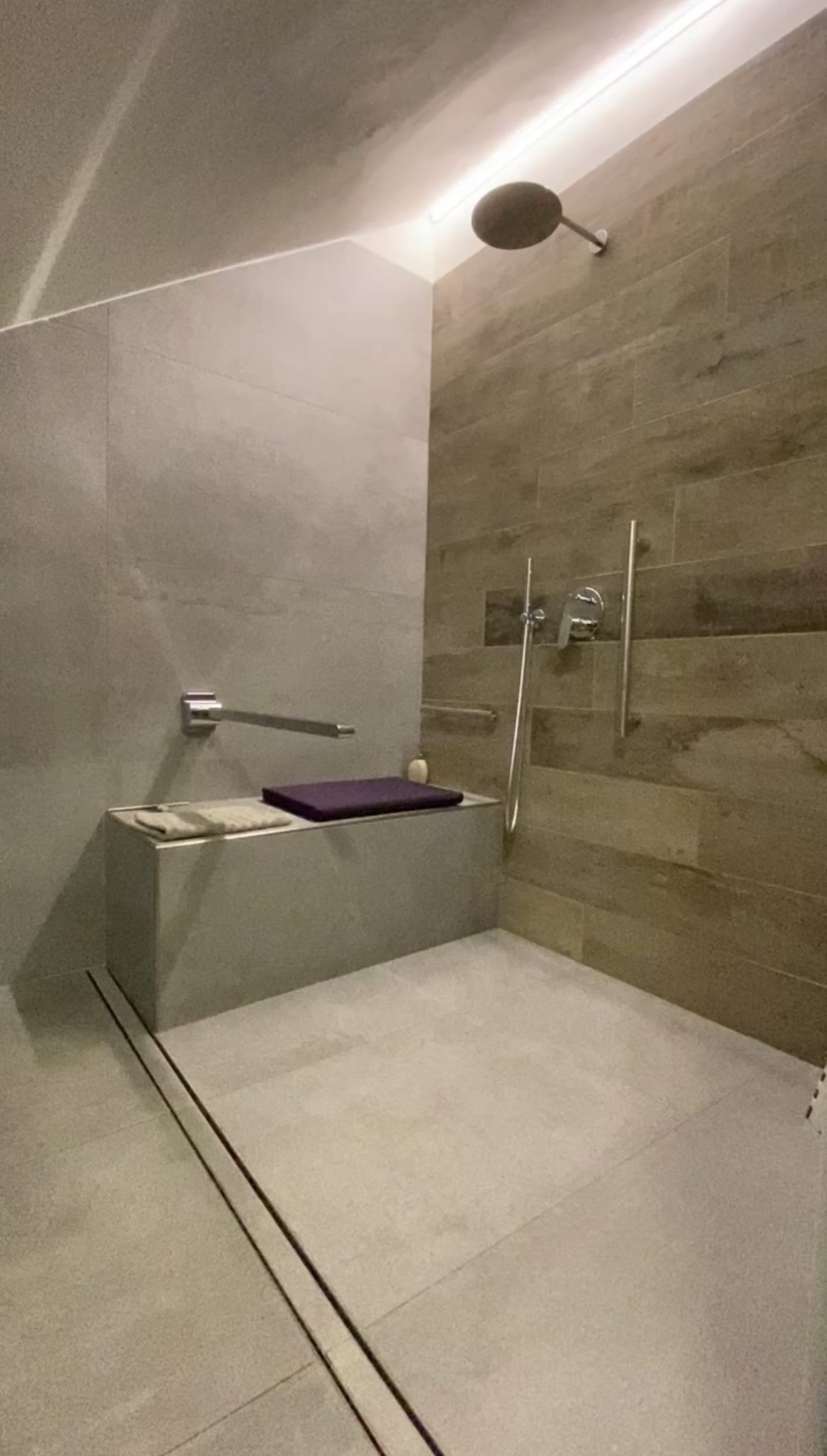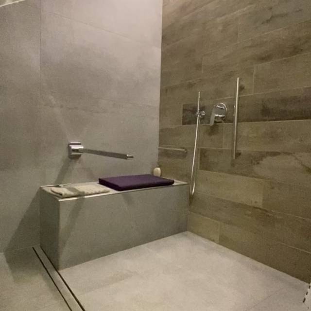 Il bagno è totalmente universal design: la porta è scorrevole, wc con maniglione a destra e sinistra, bidet, lavandino senza piedistallo sotto, specchio a filo lavandino, doccia a filo pavimento senza chiusura con seduta fatta in muratura e con maniglione.