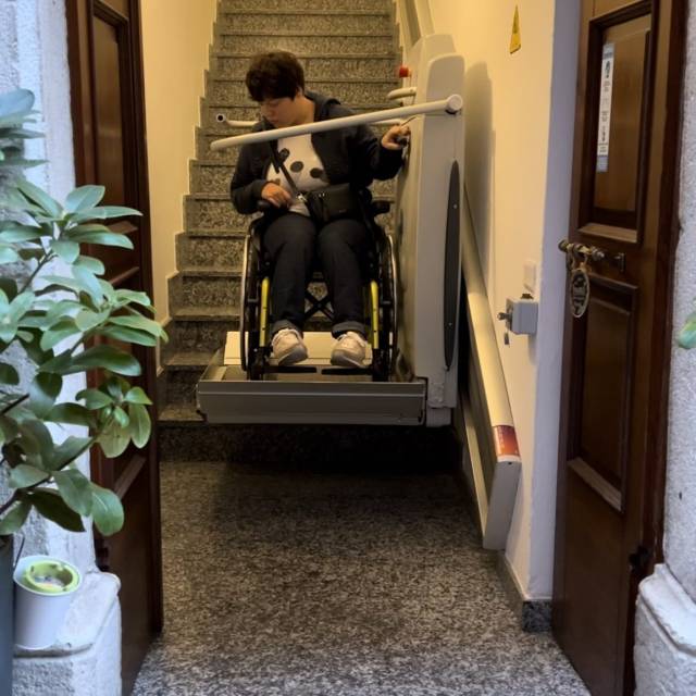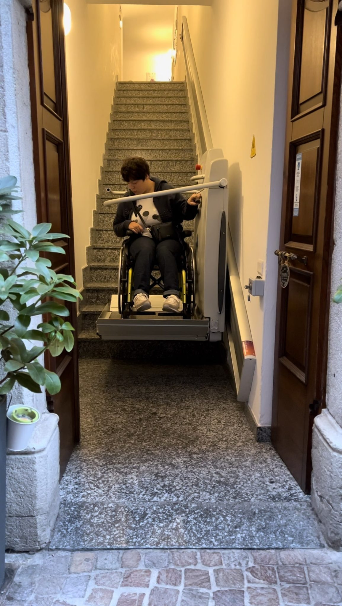 Gli appartamenti si trovano su quattro livelli, sono raggiungibili dapprima tramite montascale a pedana (per persone con difficoltà motoria, famiglie con passeggini, valigie e/o altro ) fino al primo piano e poi con ascensore fino all'ultimo piano.
