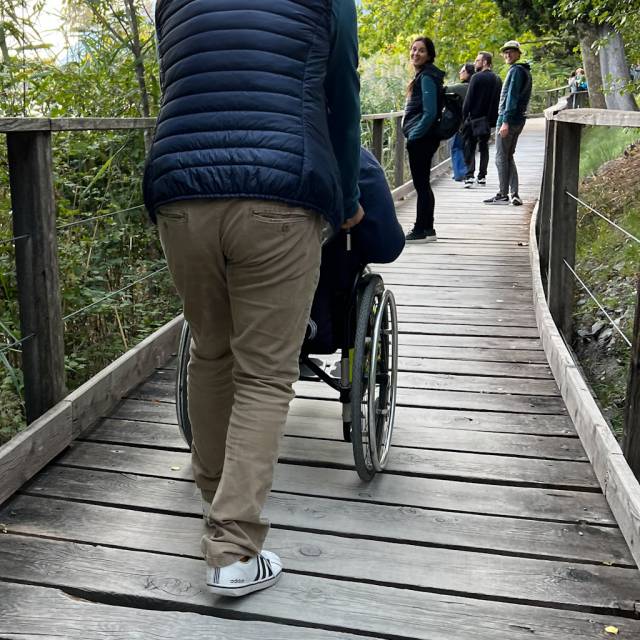 Le stecche in legno che compongono la passerella sono distanziate tra loro di qualche centimetro, attenzione con le ruote della sedia a rotelle, potreste rimanere incastrati.