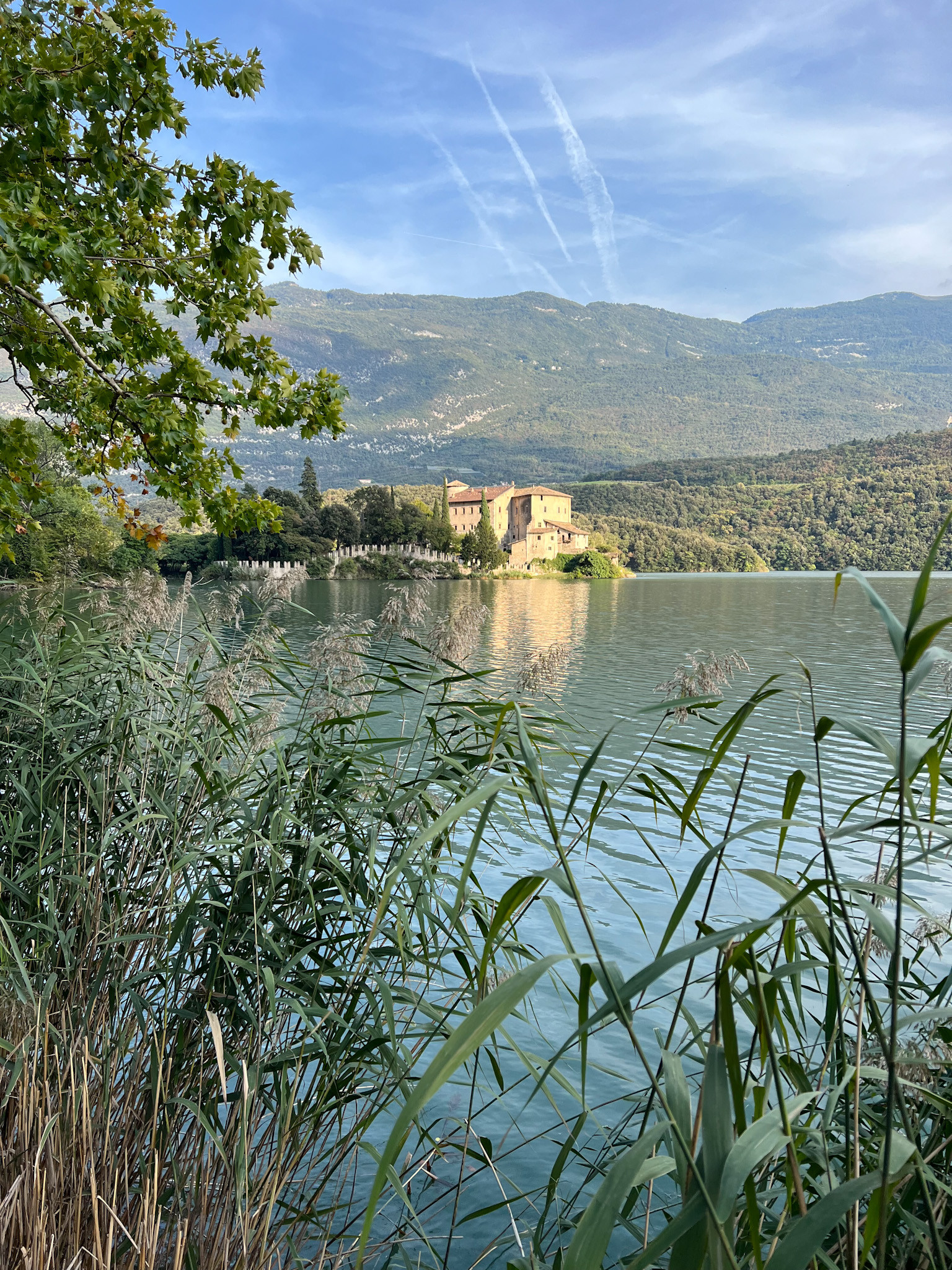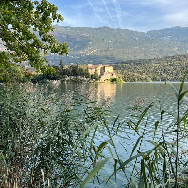 Passeggiando sulla passerella in legno che costeggia il lago, qua e là, notiamo che i canneti compongono delle piccole aperture da cui è possibile ammirare il Castel Toblino, un Castello dalle origini antichissime.